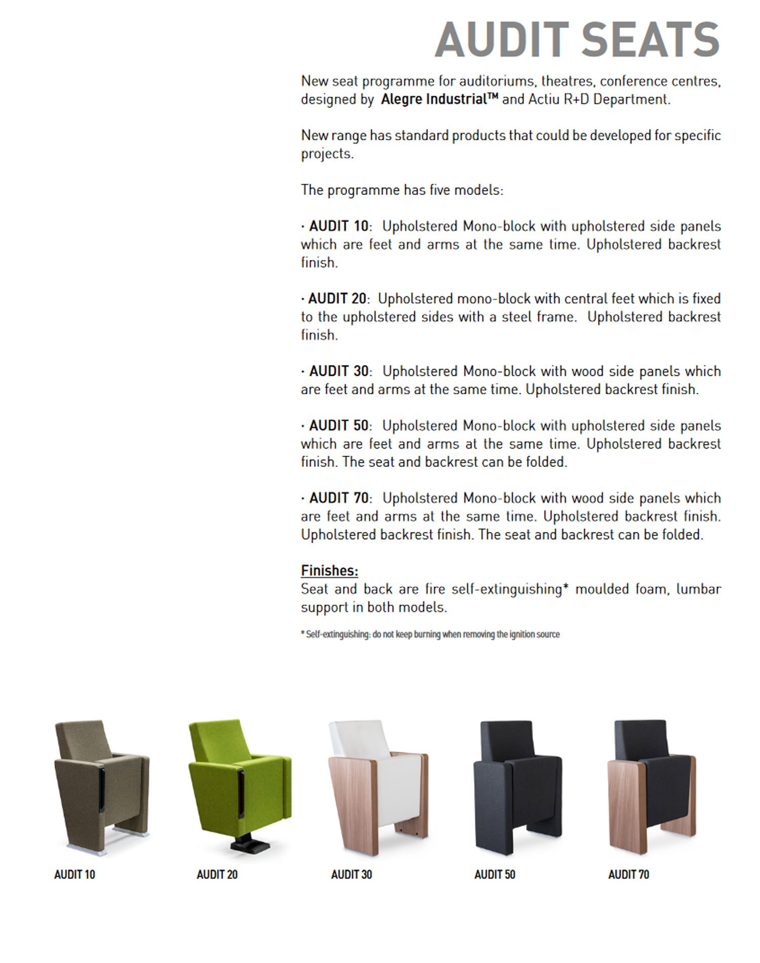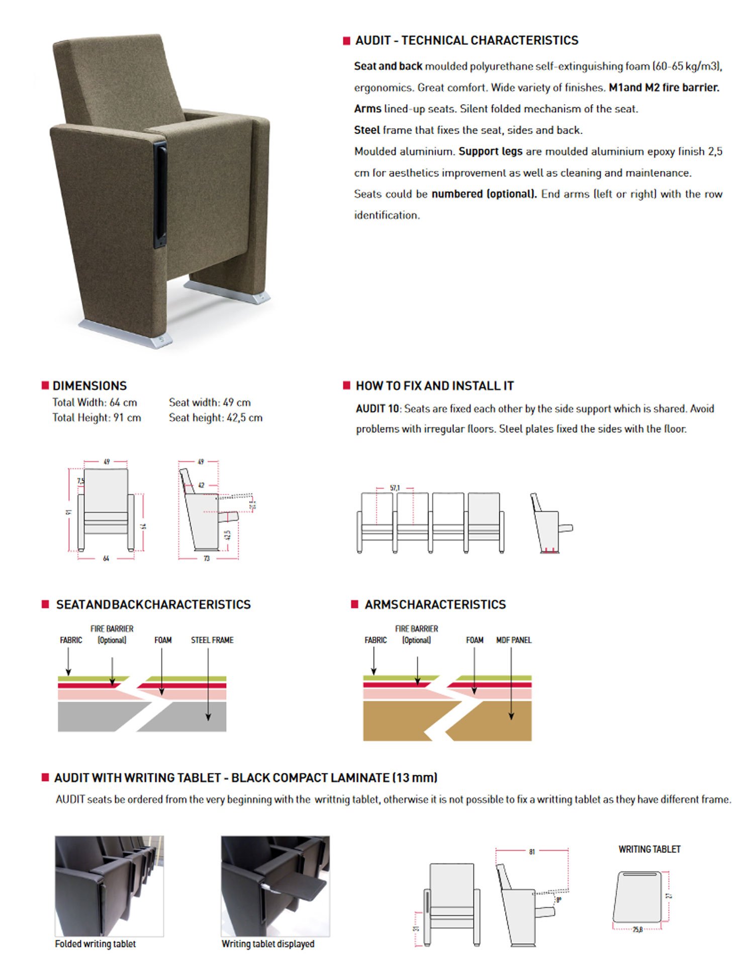 Unsere Produkte wie Kino- und Theatersessel, Hörsaal- und Konferenzsessel werden für Theater- und Konferenzsäle, Auditorien und Gemeinschaftseinrichtungen verwendet. Die Modelle können je nach Gebrauchsanweisung an unterschiedlichen lineare oder gekrümmte Layouts angepasst werden. Große Auswahl an Oberflächen (Farnen und Stoffe). M1 und M2 Brandschutz.