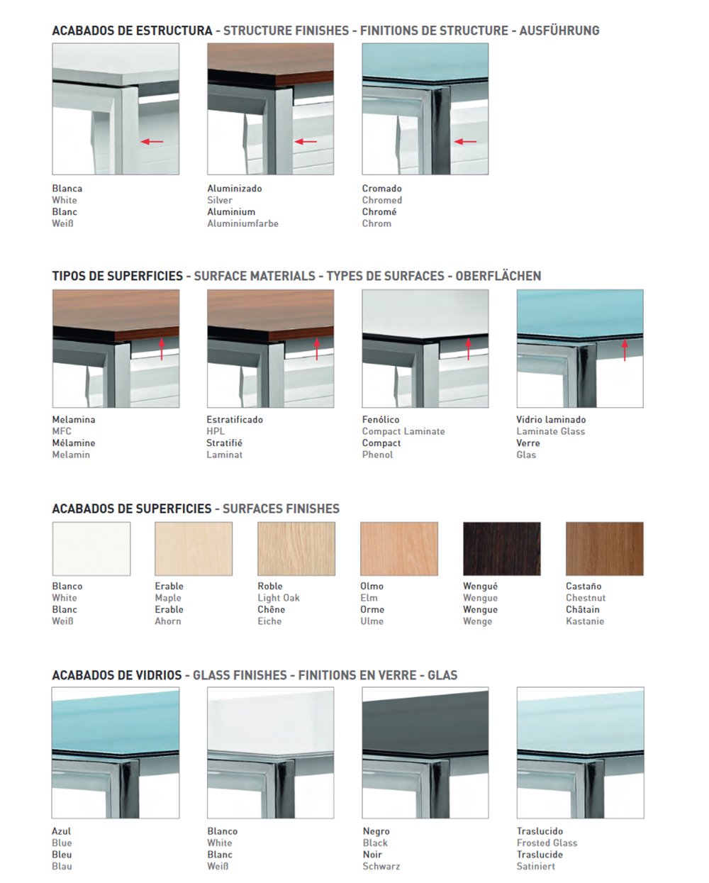 Eine Vielzahl von Oberflächen, die für verschiedene Anwendungen und Vorlieben geeignet sind und technische Materialien wie Aluminium, Acryl und natürliches Melamin kombinieren.