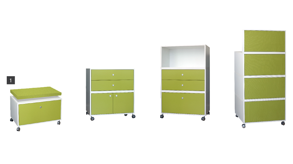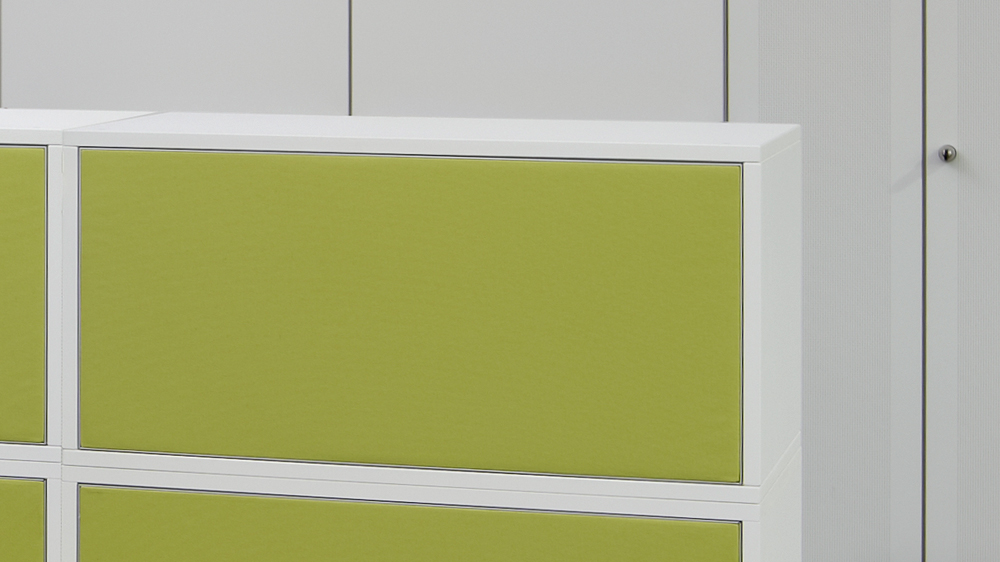 Die Akustikkunst-Officemöbel können ganz flexibel und individuell zusammengesetzt werden: von einem einzelnen Modul (Abb. 1), welches etwa mit einem passenden Sitzkissen zum Verweilen einlädt, bis hin zu vier Modulen je Container für noch mehr Abstell- und Absorptionsfläche. Jedes Modul misst 40 cm in der Höhe und kann je nach Bedarf als offenes Regalfach gestaltet, mit Schubladen oder einem Hängeregister ausgestattet werden.
