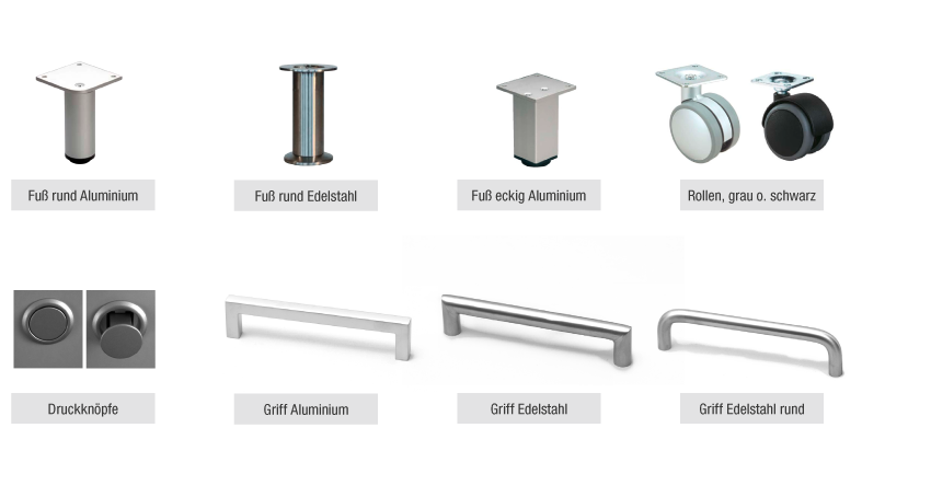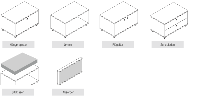 Zur Auswahl stehen Schubladen, Hängeregister sowie offene Regalfächer.