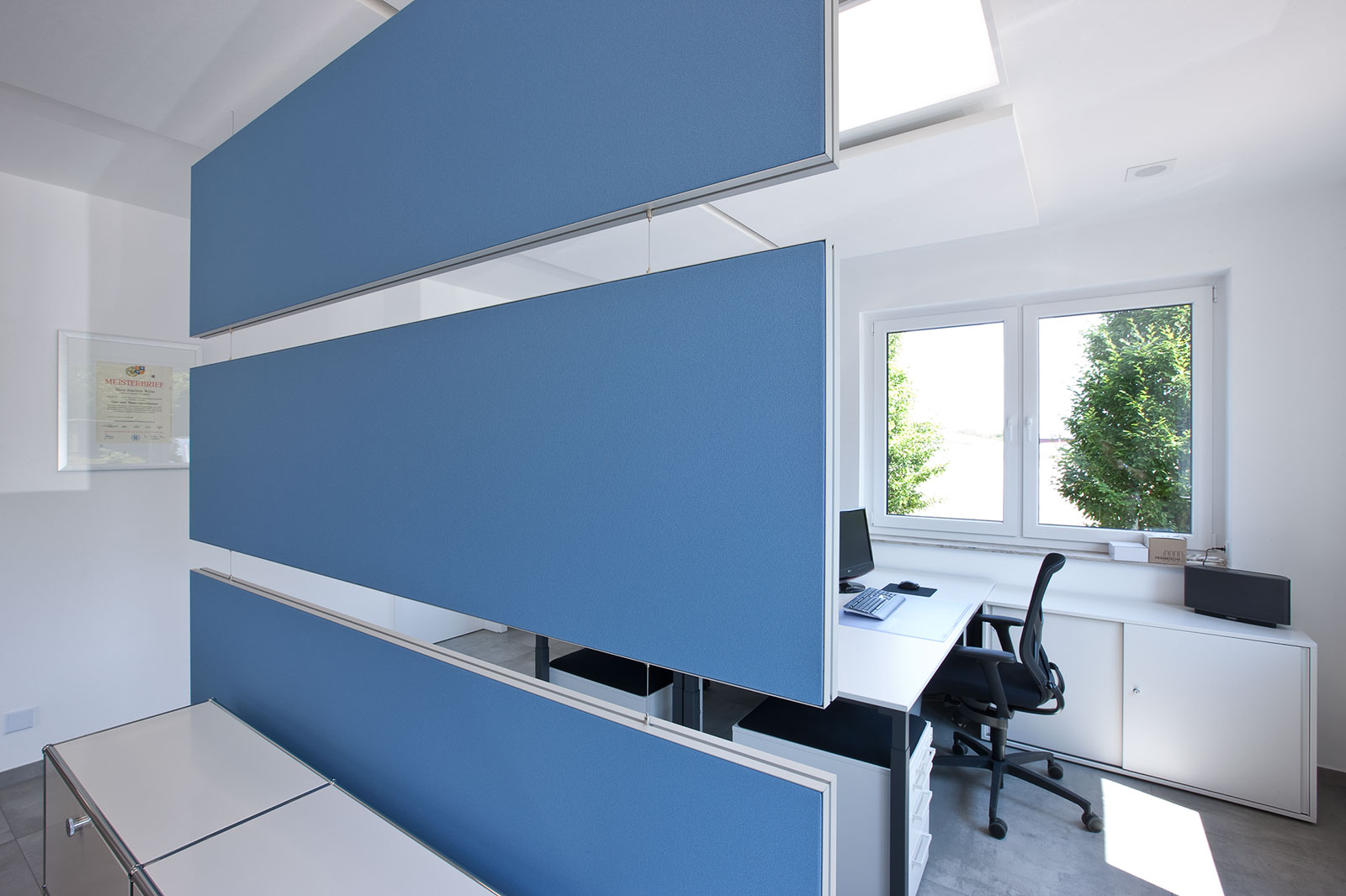 - Hochwirksame Schallschirmung einzelner Arbeitsbereiche und optische Strukturierung von Büroräumen