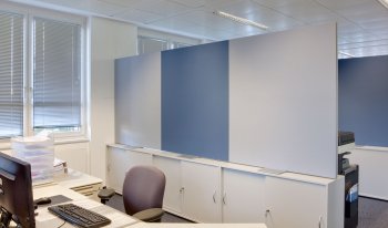 Der hochschallabsorbierende Akustik-Raumteiler bietet im freien Raum Sichtschutz und Diskretion sowie beidseitige Sichtbarkeit.