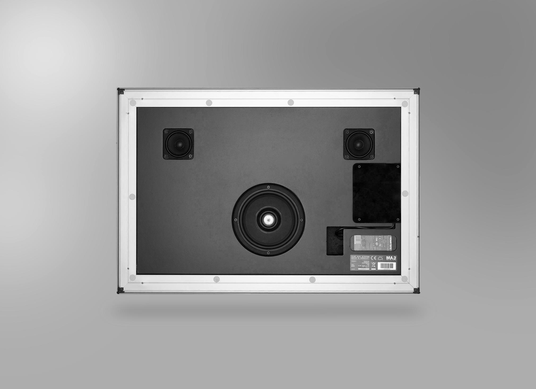 Das innovative Lifestyle-Produkt ist ein ultraflaches und leistungsstarkes Flat Hifi-System, dessen höchstintelligente und moderne Technologie sich hinter einem textilbespannten Alurahmen verbirgt.