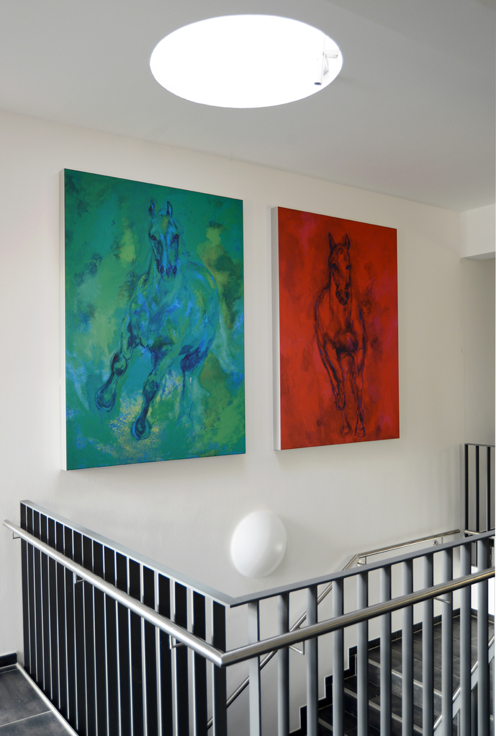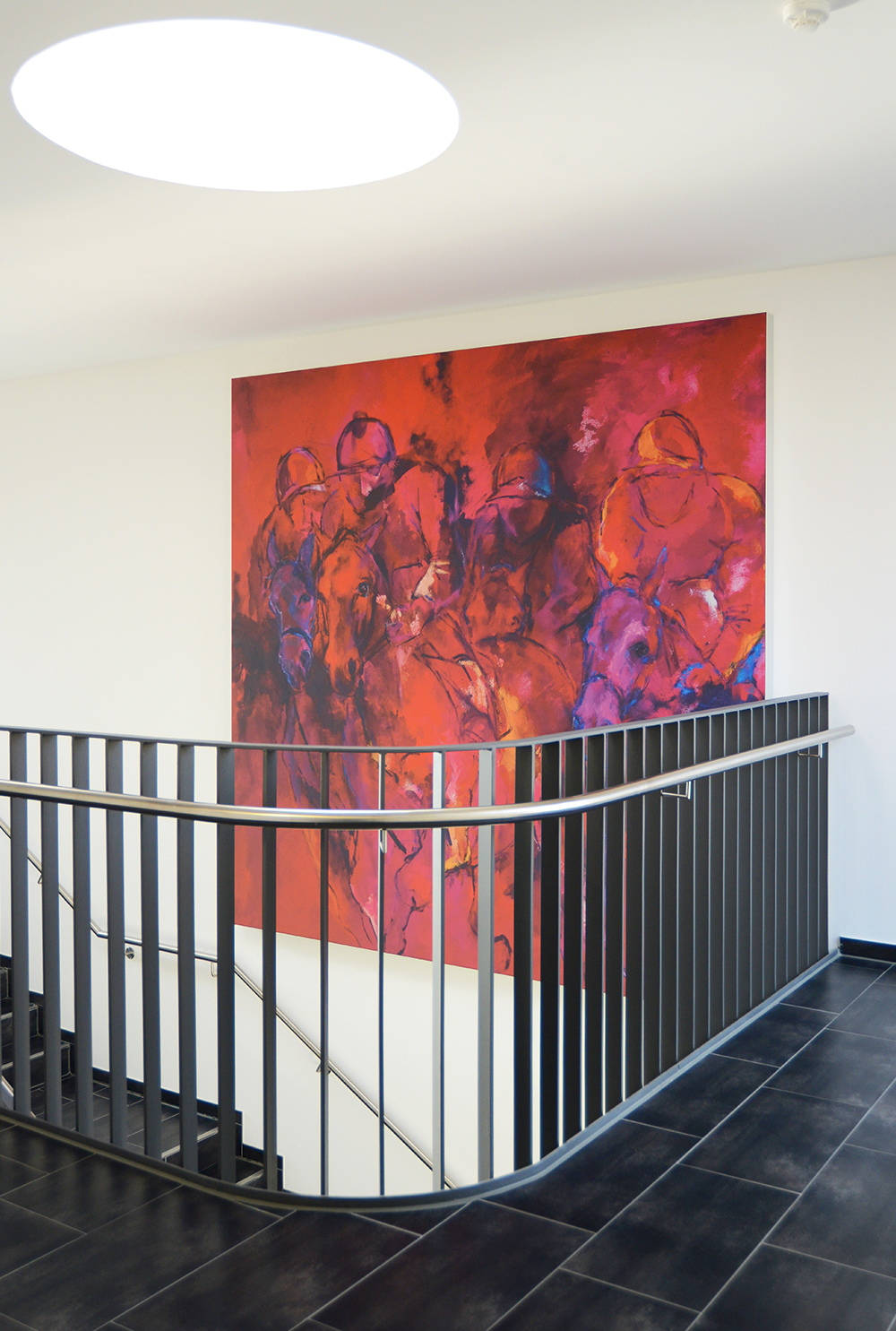 Zur Verbesserung der Raumakustik wurden im Treppenhaus hochschallabsorbierende Akustikbilder in verschiedenen Formaten eingebaut.