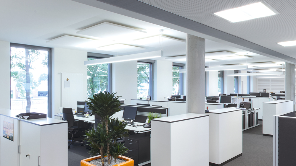 Wir wurden damit beauftragt, in den Großraumbüros, Teeküchen sowie Treppenhäusern die Raumakustik