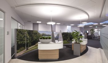 Die Akustikwand ist hochschallabsorbierend und dient als Schallschirmung, verringert somit effektiv die Schallausbreitung und sorgt zudem für eine bessere Raumakustik. Sie wurde aus diesem Grunde bewusst dem Radius des Deckensegels angepasst.